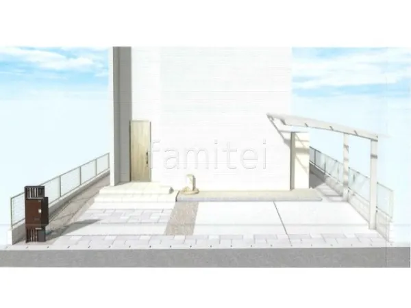 土間コンクリートと石貼りを組み合わせたアプローチは、デザイン性が高く、上質な印象に仕上がりました。 門まわりには宅配ボックス付き機能門柱 YKKAP 木製調ルシアスポルトユニットSJ02型を採用し、利便性を向上しました。 お庭には人工芝を敷き、一年中緑を楽しめるメンテナンス性の高い空間を作りました。