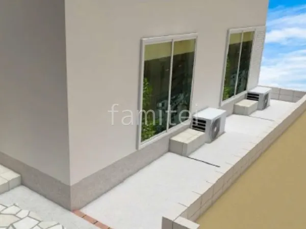 犬走の駐輪スペースは、土間コンクリート仕上げにすることで耐久性と清掃性を向上し、見た目もすっきりとした空間に仕上げました。 また、既存のコンクリート階段には300角タイル LIXIL パセオを貼り仕上げ、上質な印象をプラスしました。